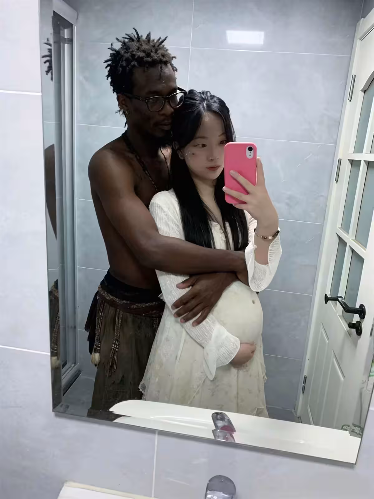 照片從浴室鏡子中捕捉。一位身著白色長裙、孕肚微隆的女子手持粉色手機,身後是她深愛的丈夫——一位笑容溫暖的黑人青年。他穿著深色褲子,赤?上身,從背後溫柔地環抱著妻子。淺灰色瓷磚牆與白色門構成簡潔背景,整個畫面寧靜而親密。