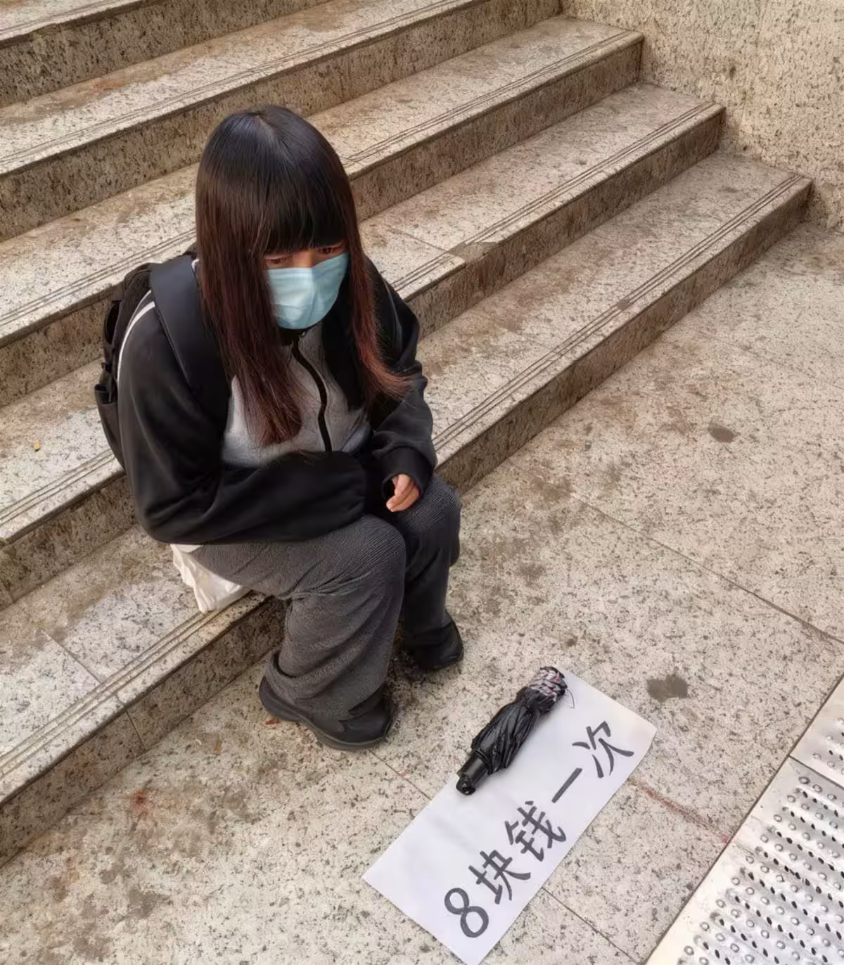 在城市中心的商業區露天樓梯口,一個戴藍色口罩的年輕女子坐在冰冷的花崗岩台階上。她面前擺著一張白紙,紙上「8塊錢一次」的黑色大字格外醒目,旁邊放著從未撐開的黑色雨傘。這種看似「租賃雨傘」的擺攤,實則是當下最新的乞討方式。