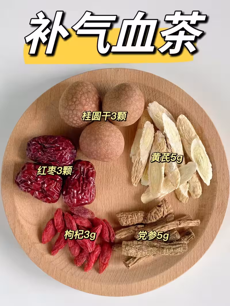 黃芪5g+黨參5g+去核紅棗3顆+枸杞3g+桂圓乾3顆