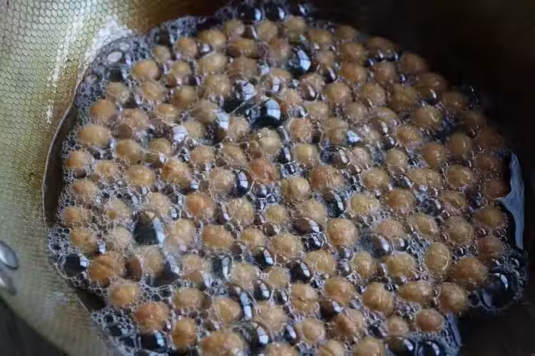 5、油溫5成熱,放入花生米炸,慢火炸至金黃色撈出即可;