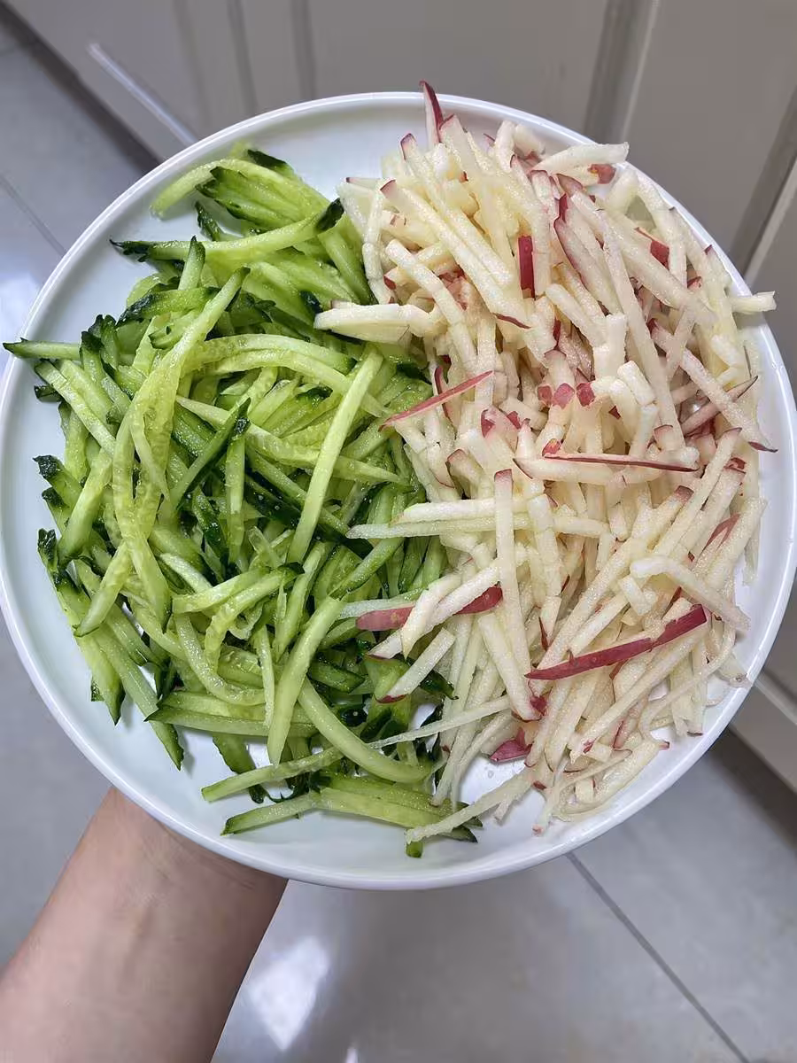 製作這種蘋果+黃瓜小吃的過程非常簡單,只需要幾個步驟即可完成。首先,準備一個新鮮的蘋果和一根黃瓜。將蘋果和黃瓜分別清洗乾淨,蘋果去核切絲,黃瓜也切成絲狀。接下來,將它們放在一個大碗中,加入適量的白糖。白糖的加入能夠提升甜味,使得這道小吃更具誘惑力。