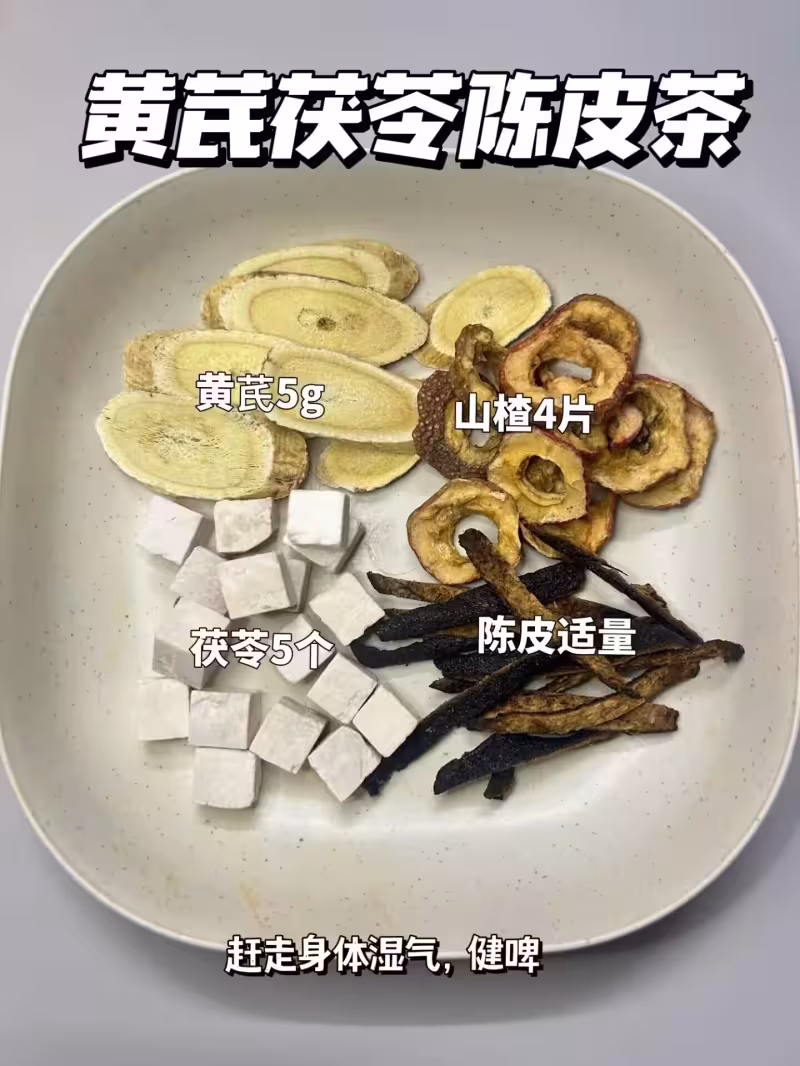 黃芪5g,山楂4片,茯苓5個,陳皮適量(趕走身體濕氣,健脾,排油脂)