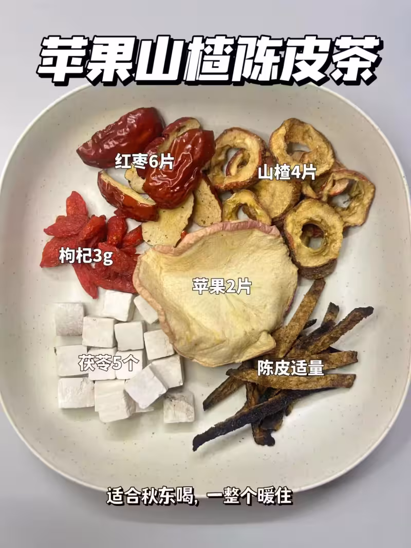 紅棗干6片,山楂 4片,枸杞3g,蘋果2片,茯苓5個,陳皮 3g(熬夜,秋冬天喝一整個暖住)