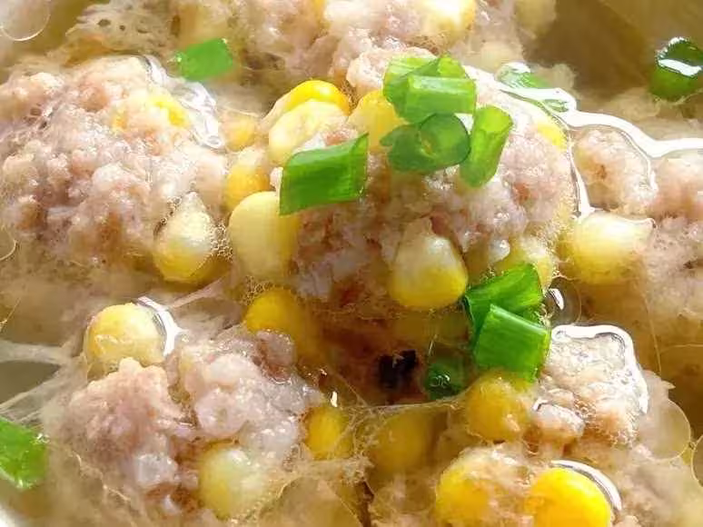 4、玉米肉丸蒸好了之後,取出來撒上蔥花即可端上桌開吃。