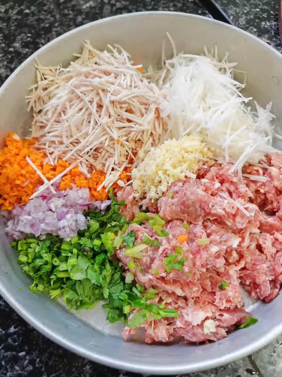 肉碎500克,沙葛絲150克,芋頭絲100克,芹菜粒35克,洋蔥碎59克,紅蘿蔔碎50克,蒜頭一湯匙。薯粉55克,綠豆粉5克,五香粉,蚝油,麻油和糖。