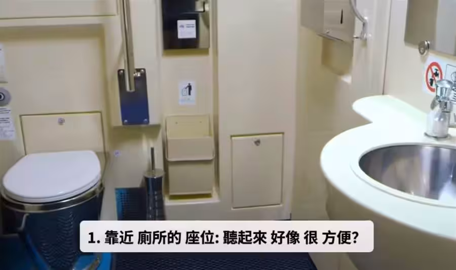 2. 最後一排的座位 這個位置常常是「被剩下」的,這些椅背不能完全後躺,後面是牆,完全沒得靠。 送餐、收餐總是等很久,熱門餐點常常早就被拿光,而且有些機型尾部引擎聲比較明顯,引擎噪音太大,讓人非常不舒服。