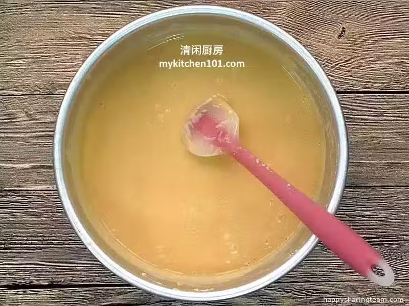 4)把糯米粉篩過,在把糯米粉一點一點加入,用手拌器把糯米粉和焦糖水攪拌混合均勻,直到麵糊順滑沒有糯米粉顆粒為止,再加入食油攪拌均勻。