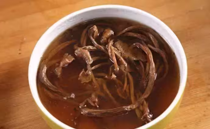 2.干香菇泡軟瀝干水分;白蘿蔔葉洗凈切粗片,備用。