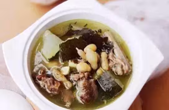原料:冬瓜80克,薏米50克,水鴨250克,清水1400克,姜10克,青蔥15克、鹽5克,雞精3克,糖1克,胡椒粉1克。