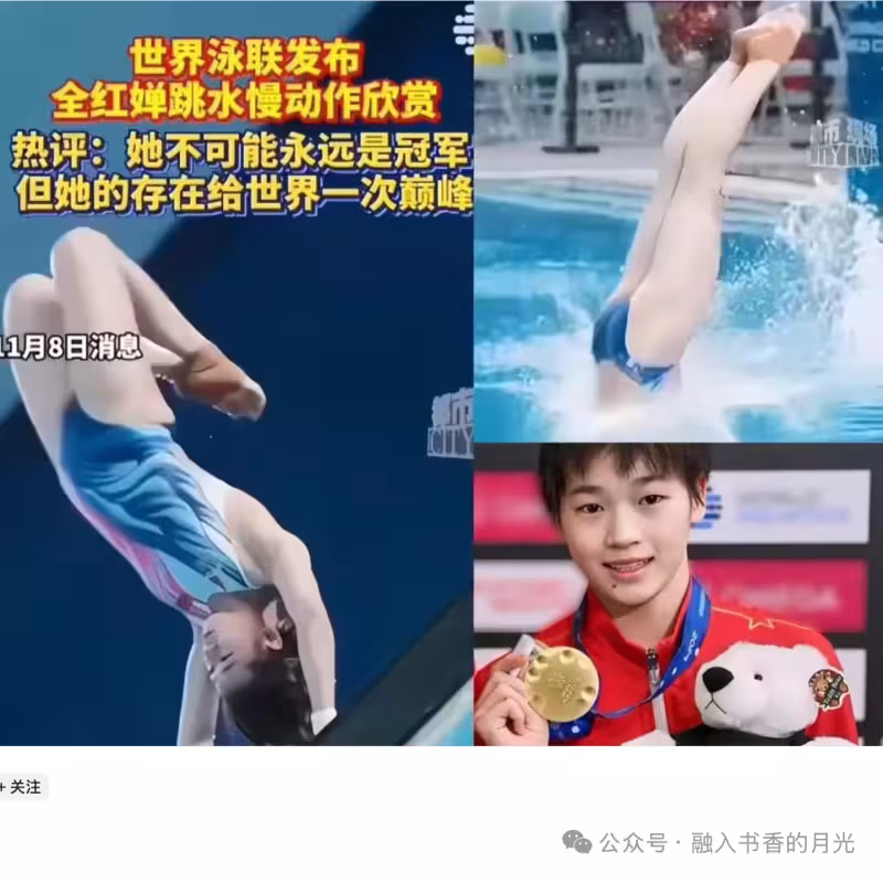 世界泳聯連夜發全紅嬋的慢動作視頻,配文直接封神:「她不可能永遠是世界冠軍,但她的存在,給了世界一次巔峰」!這哪是普通評價啊,分明是把 17 歲全紅嬋名字,鐫刻在跳水界的歷史豐碑上!