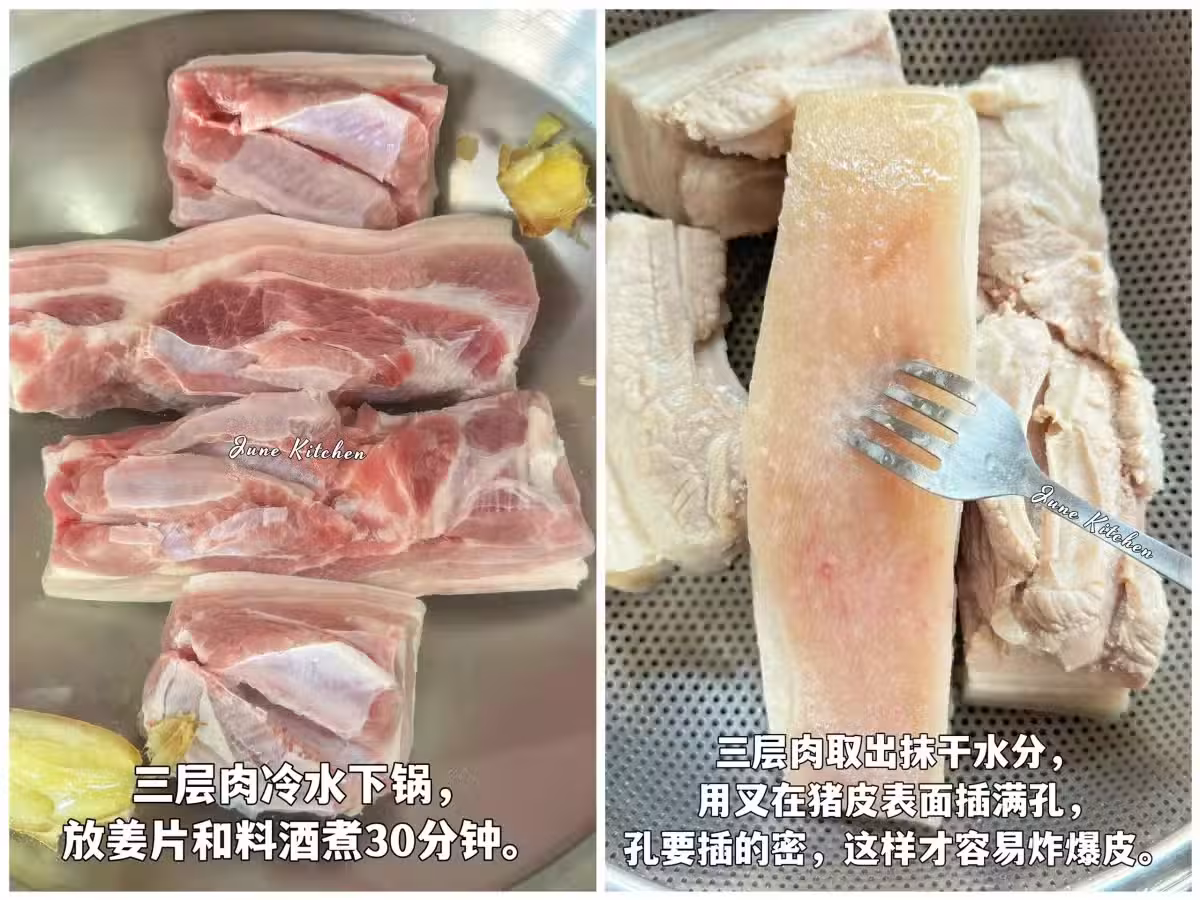 1️⃣三層肉冷水下水,放薑片和料酒煮三十分鐘。三層肉取出抹乾水分,用叉在豬皮表面插滿孔,孔要插深一點,這樣才容易炸爆皮。