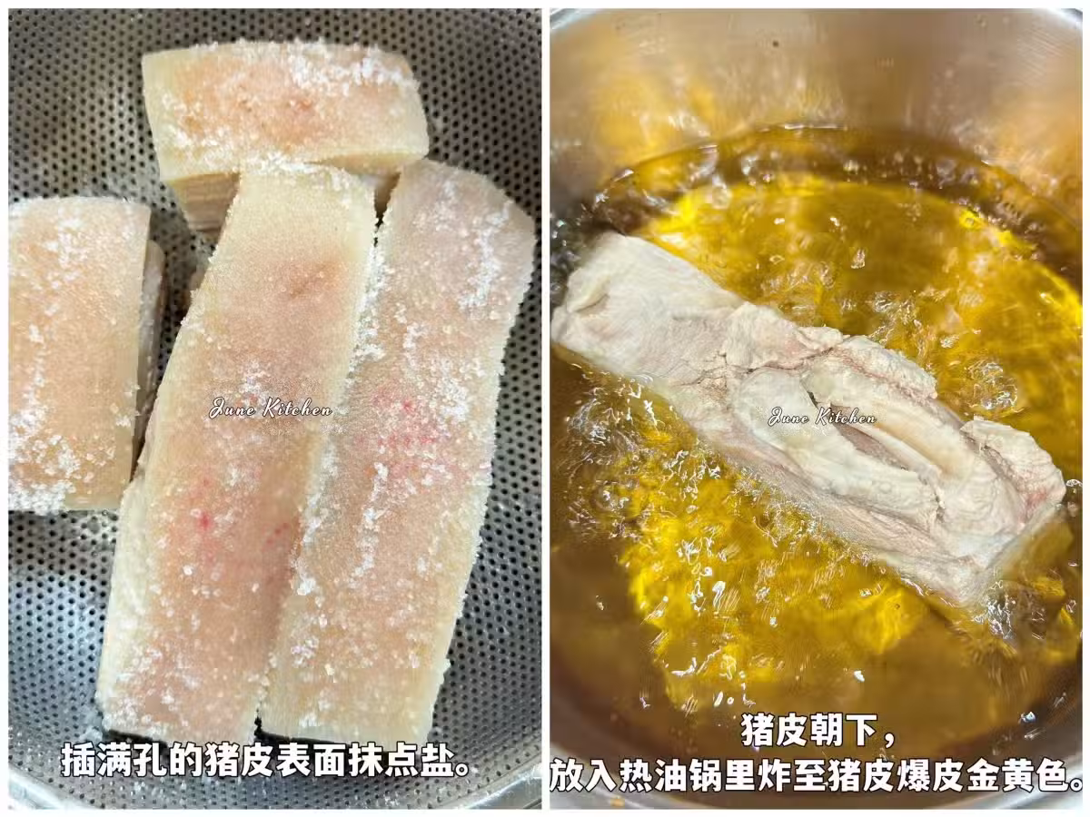 2️⃣插滿孔的豬皮表面抹點鹽。豬皮朝下,放入熱油鍋里炸至豬皮爆皮金黃色。
