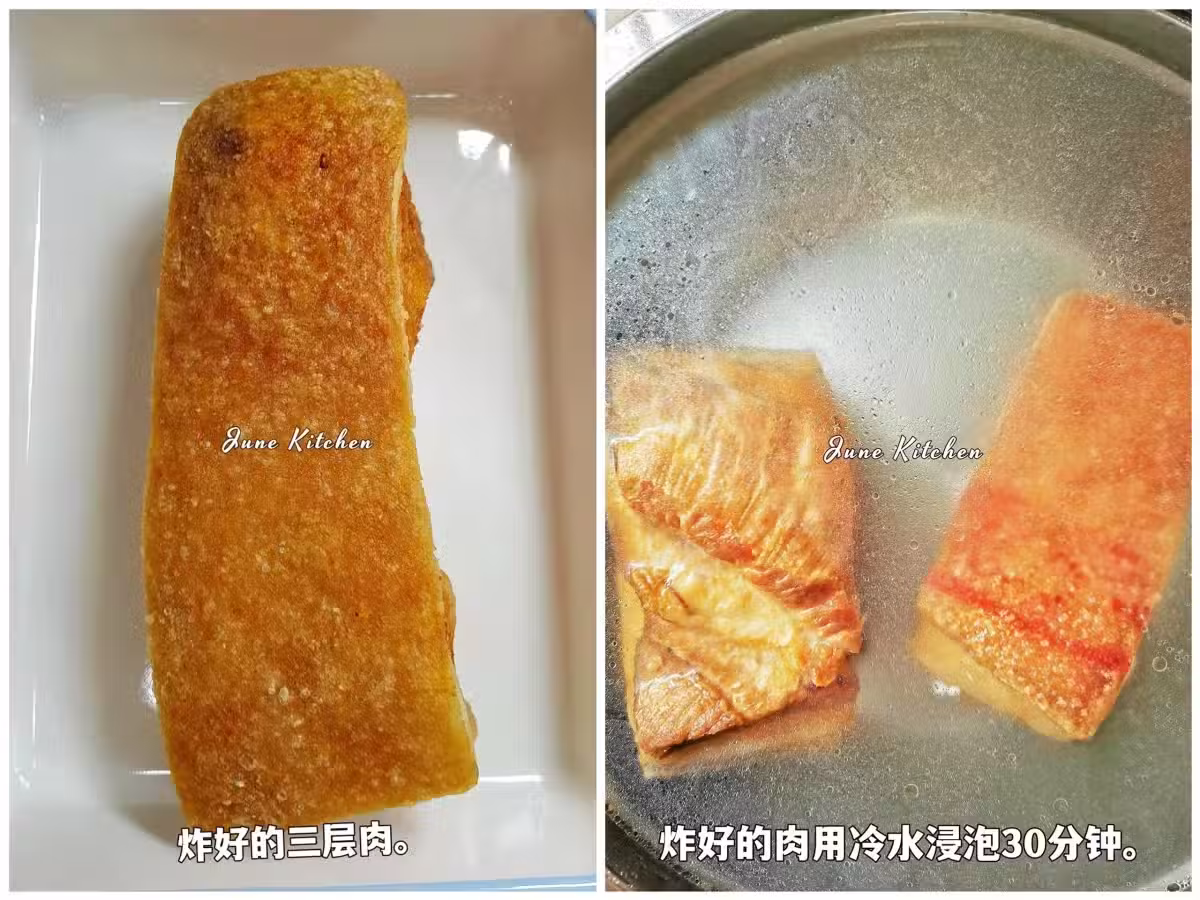 3️⃣炸好的三層肉,炸好的肉用冷水浸泡30分鐘。