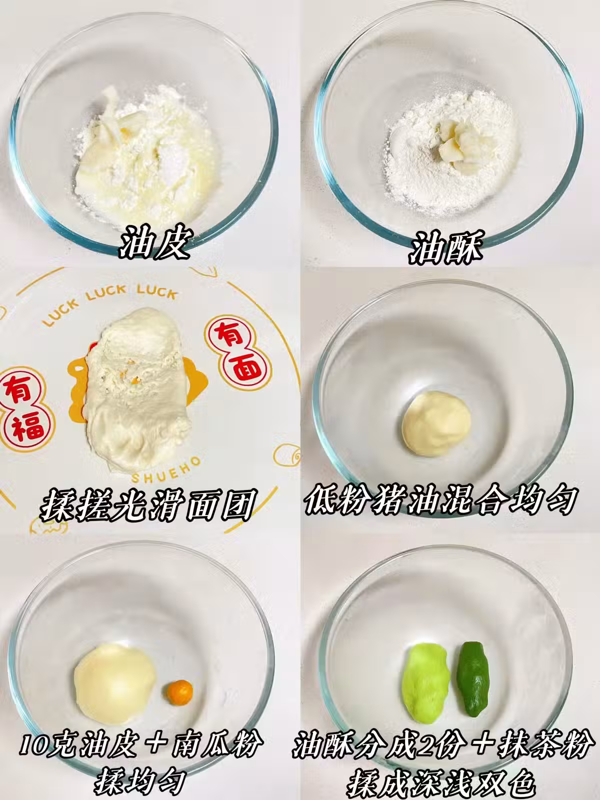 1️⃣油皮所有材料揉均勻光滑分出10克加南瓜粉或檸檬黃色素揉均勻,油酥所有材料混合成團後分出55克加抹茶粉分別調成深、淺兩色,油皮、油酥冷藏鬆弛30分鐘