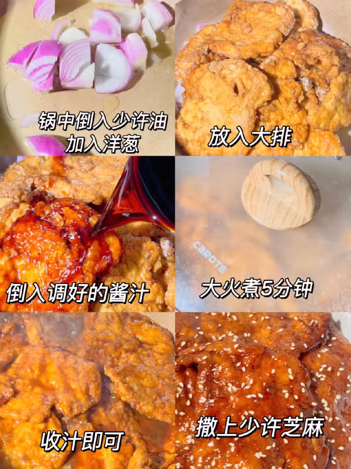 4。鍋中倒入少許油,倒入洋蔥,再倒入煎好的豬排,倒入提前調好的醬汁,煮至沸騰大火收汁即可,出鍋前可以撒上芝麻裝飾,是不是超級簡單