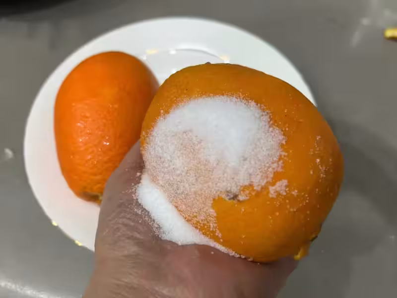 我用了兩個橙子,一個是薄皮的橙子,我用鹽仔細的搓擦表面污漬,再用清水沖洗乾淨帶皮切片。另一個橙子是直接洗乾淨剝去皮切片。