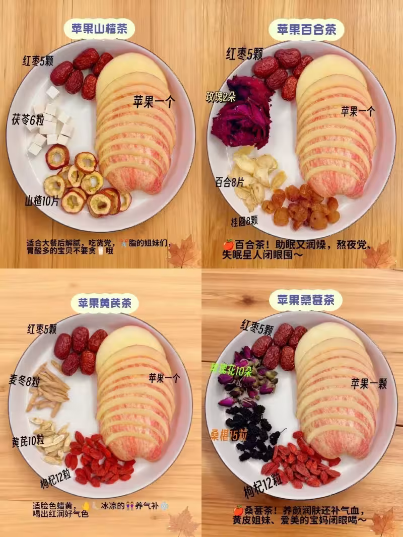 她跟我說她有4個配方,根據不同的身體情況換著喝,有時候晚上睡不好就喝安神的,有時候吃多了油膩就喝刮油的,反正都是用蘋果做底,再加點別的食材一起煮,簡單得很,我當時就記下來了,回家自己也試了試,沒想到效果還挺好的。