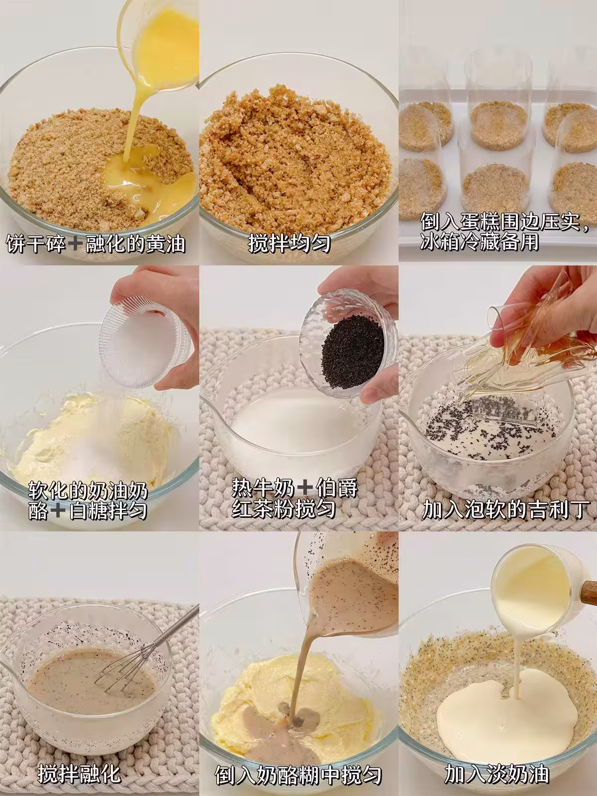 伯爵紅茶芝士: 奶油乳酪200g 白糖50g 熱牛奶50g 伯爵紅茶粉4g 吉利丁片8g 淡奶油160g