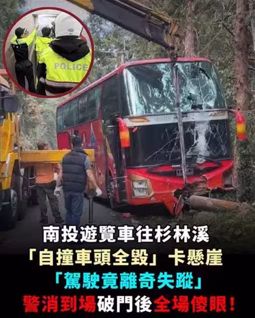南投遊覽車往杉林溪「自撞車頭全毀」卡懸崖「駕駛竟離奇失蹤」警消到場破門後全場傻眼!