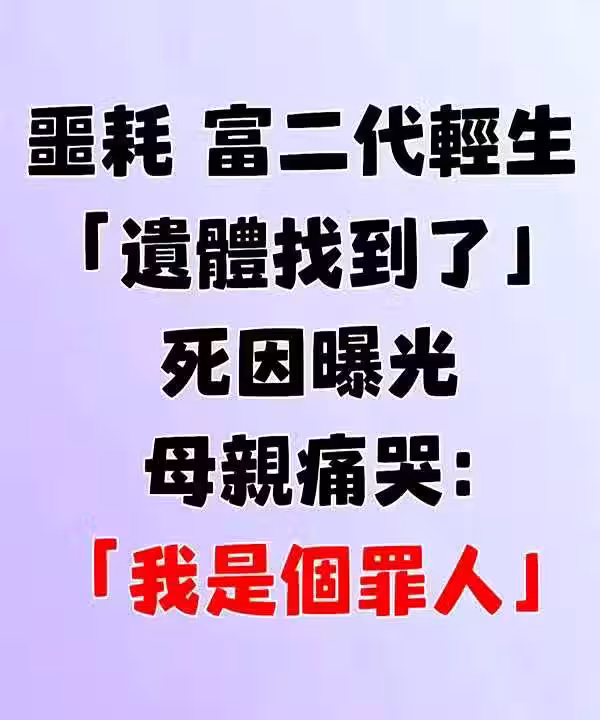 噩耗!富二代輕.生「遺.體找到了」死因曝光 母親痛哭:「我是罪人」