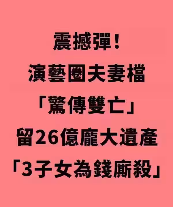 演藝圈夫妻檔「驚傳雙亡」 留26億龐大遺產「三子女為錢廝殺」