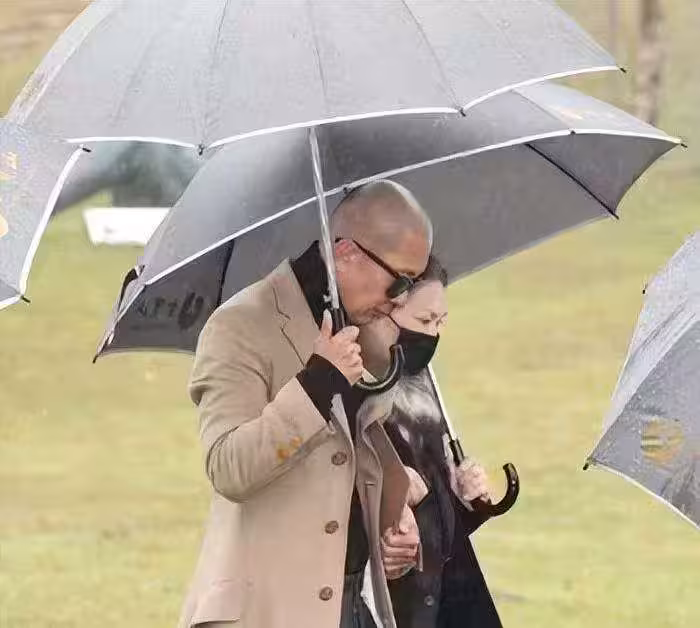 首先映入眼帘的就是具先生穿著一件米色的外套,旁邊的S媽挽著他的手臂,兩個人走在最前方,身後更是跟著許多的好友。