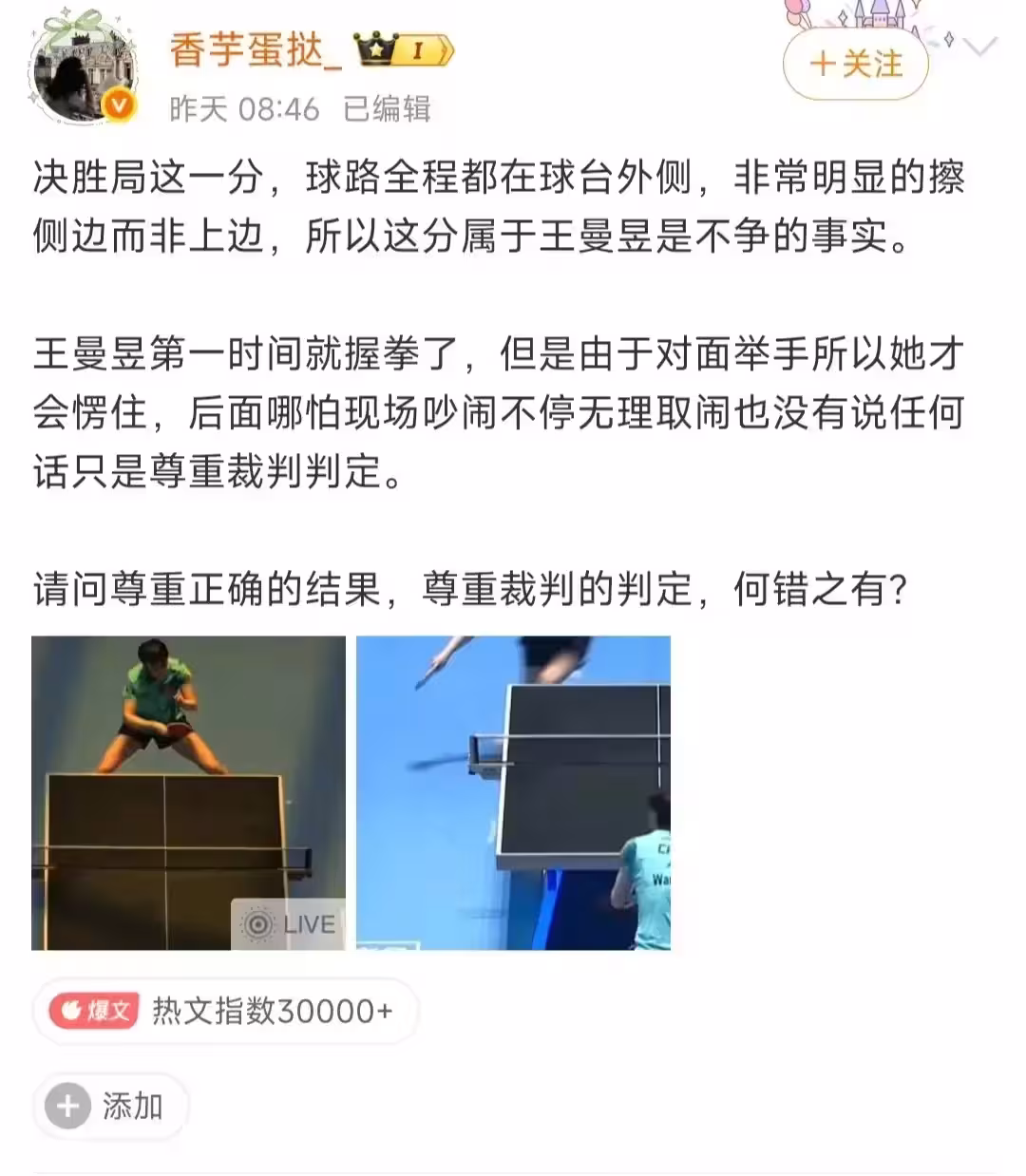 這不是王曼昱第一次遭遇大規模網暴。從2024年澳門世界盃到乒超聯賽,再到今年的亞洲杯,針對她的攻擊幾乎從未停止。一位體育大V直言:「王曼昱就是被飯圈網暴最嚴重的一個運動員,沒有之一。」