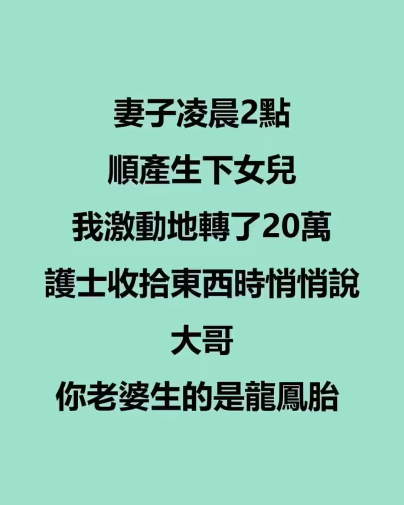 喜悅沖昏了頭腦,直到一位年輕護士在收拾醫療垃圾時,走到我身邊,用幾不可聞的聲音飛快地說了一句:「大哥,別高興得太早,你老婆生的其實是龍鳳胎。」