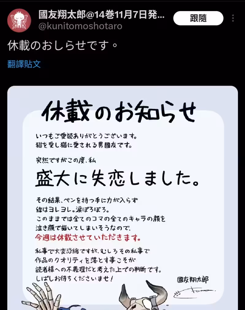 國友翔太郎在今年 1 月底時,提到自己失戀後打擊太大,所以握筆的手無法施力,畫出來的線條也都歪歪扭扭,眼淚更是不斷滴下來,並表示:「再這樣下去,感覺我會把每一格畫面的所有角色都畫成在哭的樣子,所以這周請容我休刊。」強調雖然抱歉,但不希望讓作品的品質下降。