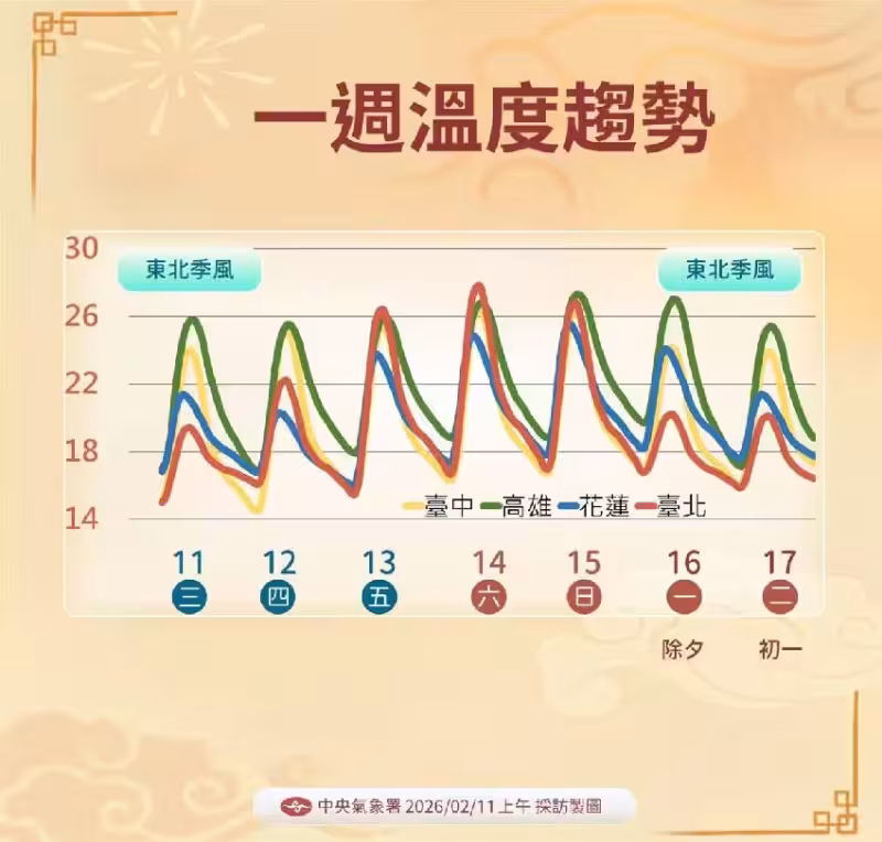 初一、二(17、18日)東北季風影響,北部、東半部有區域性短暫雨的機率,北台偏涼微冷;中南部晴時多雲、影響輕微。