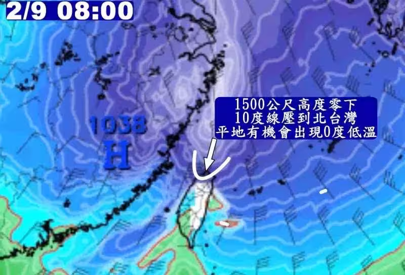 10年前的2016霸王級寒流令人印象深刻,甚至成為冬季冷空氣到底冷不冷的對照組,而根據美國模式預測,台灣在2月初可能會迎來「比霸王級寒流更強」的冷空氣?臉書天氣粉專「觀氣象看天氣」表示,美國模式預測2月9日清晨「1500米高度零下10度線」接觸北台灣,平地可能出現0度氣溫。