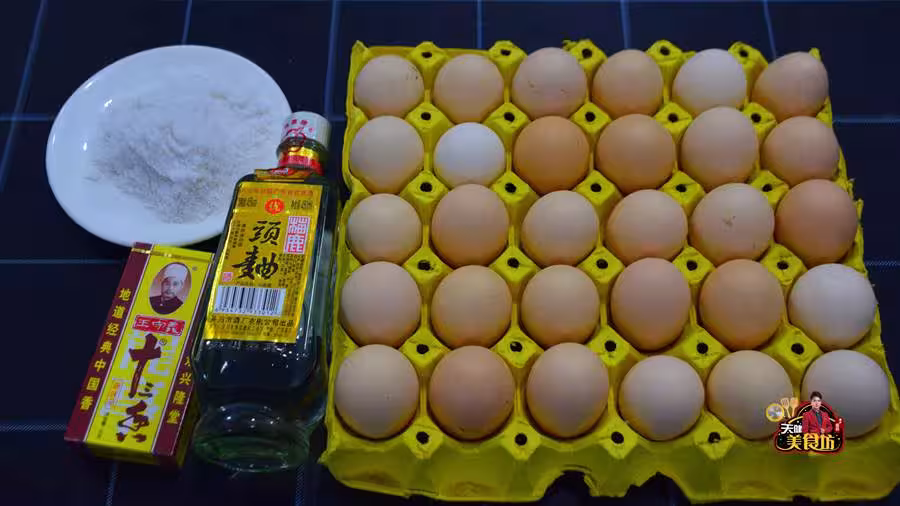 在開始正式製作之前呢,我們首先需要準備以下食材:雞蛋1托,高度白酒半碗,十三香1盒,食鹽250克