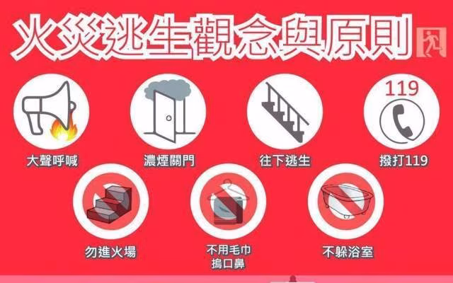 火災逃生核心原則是「往下、往外逃生」,切勿搭電梯、不可躲浴室。