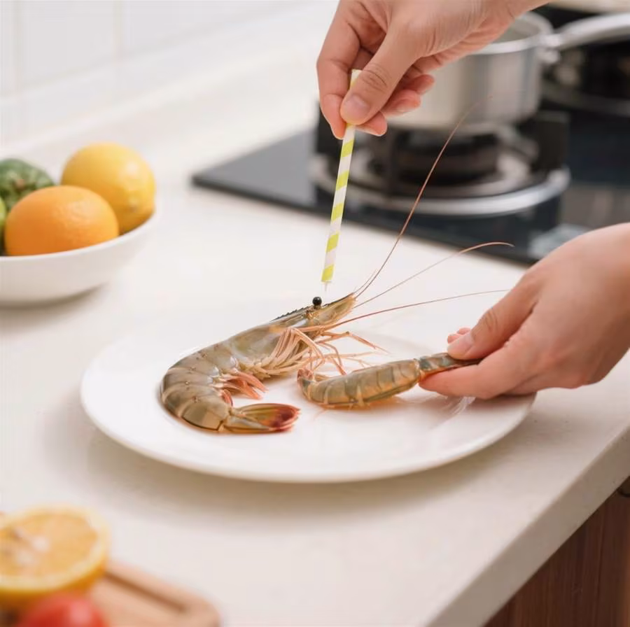第三個方法需要用到一根吸管。將蝦平放在案板上,用手握穩蝦身,將吸管的尖端從蝦頭的中間[插·入],然後輕輕按壓並挑動,這樣可以將蝦胃和蝦線挑出。這種方法簡單快捷,適合處理大量蝦的情況。