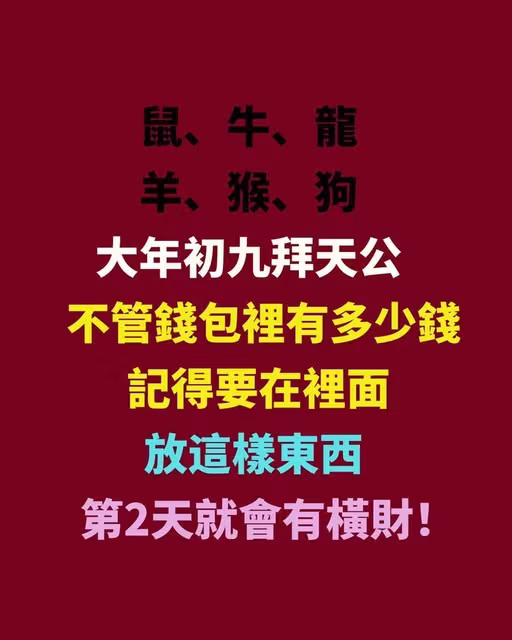 「鼠、牛、龍、羊、猴、狗」大年初九拜天公,不管錢包里有多少錢,記得要在裡面放這樣東西,第2天就會有橫財!