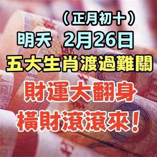 明天2月26日(正月初十)五大生肖渡過難關,財運大翻身,橫財滾滾來!