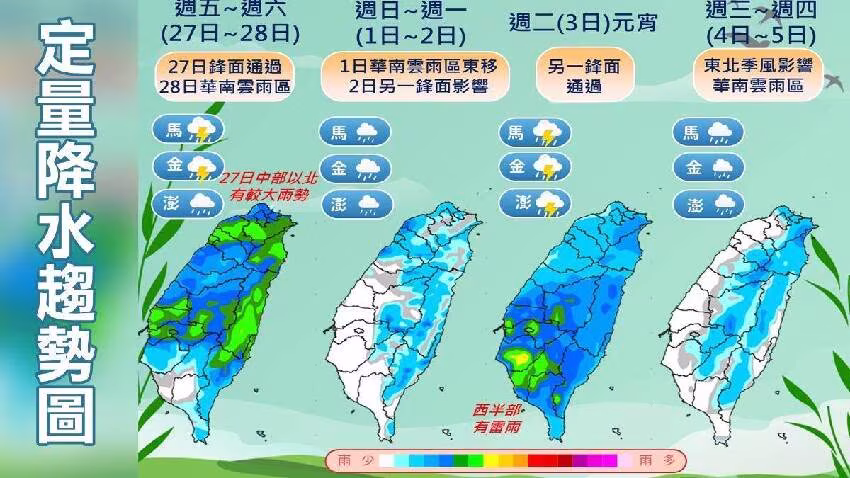 針對未來天氣,氣象署說,下周一(3/2)受到另一鋒面影響,北部及東北部地區有短暫陣雨,中部、東部、東南部地區及恆春半島有局部短暫陣雨,南部地區亦有零星短暫陣雨。