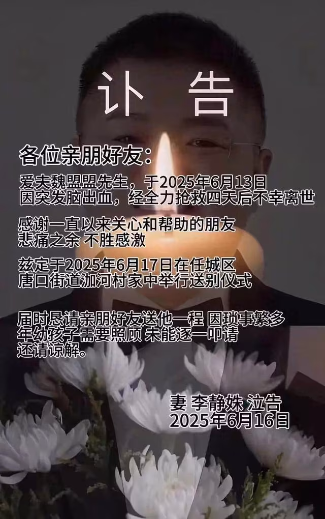 2025年6月16日,濟寧網紅「大盟1888」妻子李靜姝女士在社群平台發布了訃告,自己的丈夫魏盟盟,於6月13日突發腦出血,經過醫院全力搶救四天後不幸去世,年僅32歲,留下妻子和年幼的孩子。