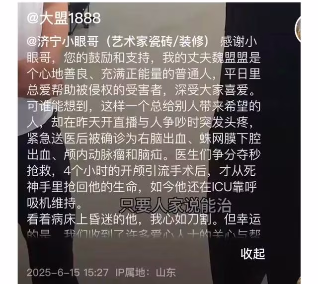 根據山東濟寧當地的一位知情者的說法,魏盟盟是在6月13號開啟直播的時候,與一位黑粉發生爭吵過後,可能是因為情緒太激動了才引發的腦出血。