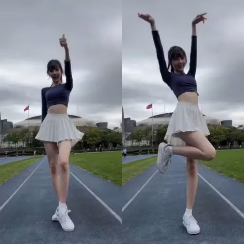 衣宸昨(2)日在IG上傳一段Reels,她扎著高馬尾,穿深藍色貼身短版上衣,路出小蠻腰和馬甲線,下半身穿白色百褶裙,露出一雙鉛筆腿,於操場跑道上隨著Taylor Swifte歌曲〈Opalite〉跳舞,雖然只是簡單的扭臀、甩手等動作,依然萌度破表。