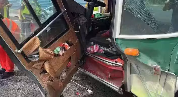 且又因過度右轉而導致車身朝左傾斜,車頭也以45度向外側車道偏移,造成小客車遭受擠壓、撞擊。