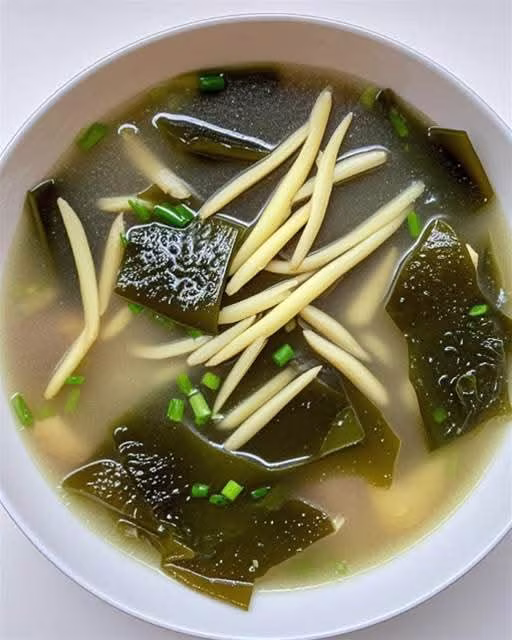 鍋中加入適量清水,放入海帶和薑絲,大火煮開後轉小火煮 15 - 20 分鐘,直到海帶煮至軟爛。加入適量鹽調味,滴入幾滴香油,撒上蔥花,一碗熱氣騰騰、刮油又暖胃的海帶生薑湯就完成了。