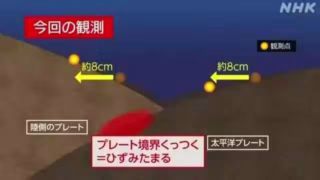 而設置在陸側板塊、靠近海溝軸的觀測點也同樣每年移動約8公分,