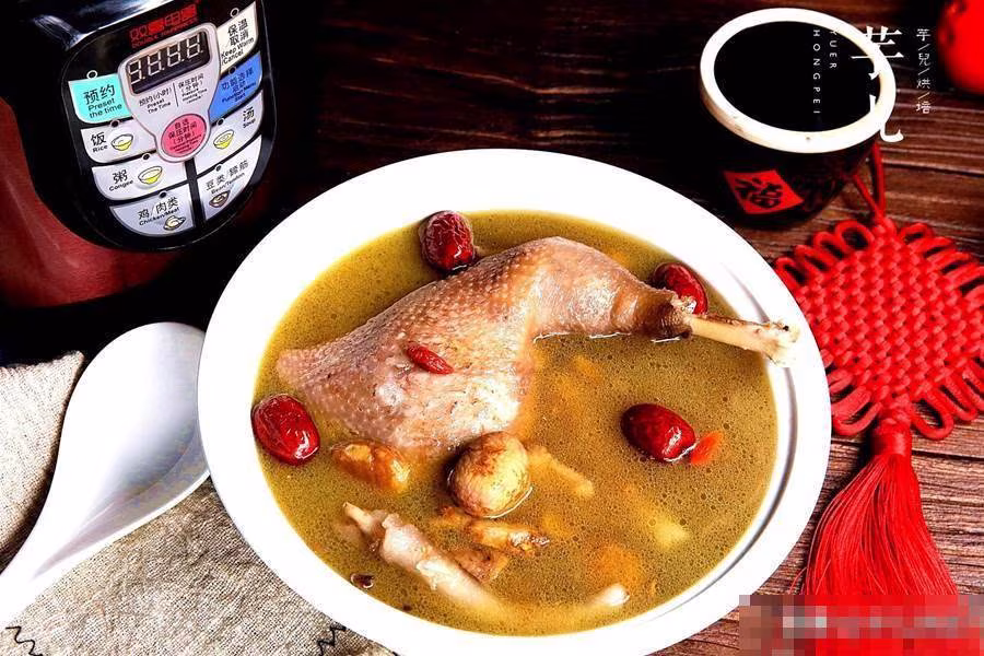 食材:母雞 半隻,板栗 300克,紅棗 5里,沙根 3根,黃芪 一根,枸杞 數粒。