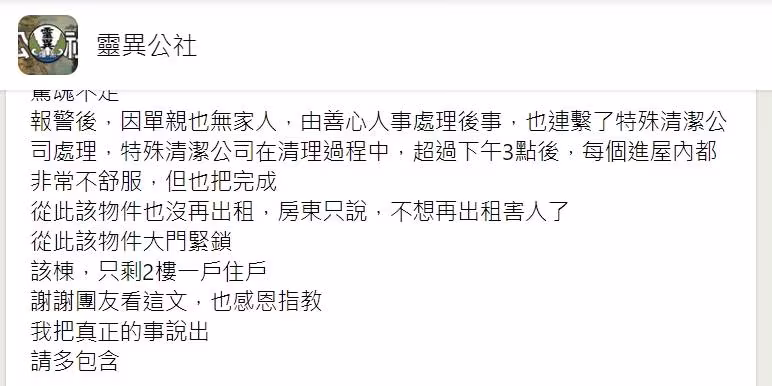 至於該房子最後,還是被投資客買走,而且沒有作法事就出租,原本鄰居就常常在租客入住前,聽到房子裡面傳來各種聲響,更離奇的是,後面該房又有3條人命離開,最後房東也不再出租,坦言最後一次出租,因為有單親媽媽多天都沒給房租,他過去一看,才發現單親媽的遺體掛在上面,濃濃屍臭味沖門而出,讓他嚇得倒退三步,最後也不想再害人,就把房子塵封了。