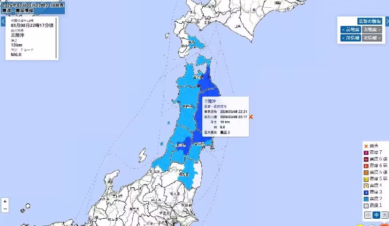 岩手縣方面,盛岡、花捲、八幡平等多個城市也都測得震度,另外像是奧州、瀧澤以及矢巾等地區,