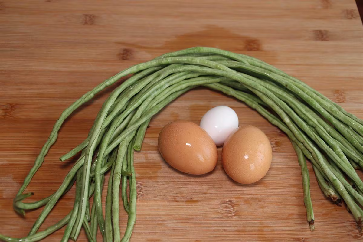 5、將雞蛋液倒入豆角上面,攪拌均勻