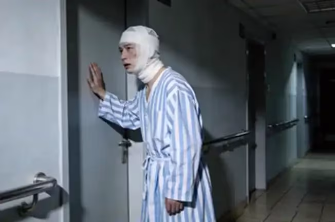 他穿著一身寬大的病號服,紗布從額頭一直纏到脖頸,只露出兩隻眼睛和一張沒有血色的嘴。