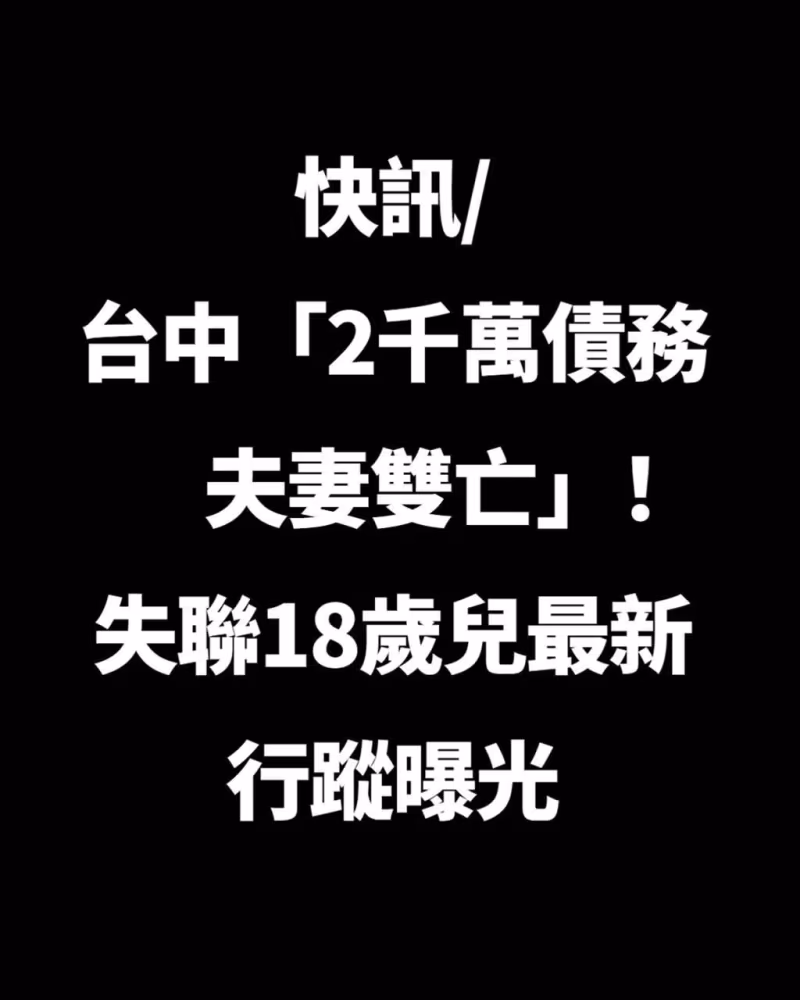 快訊/台中「2千萬債務夫妻雙亡」!失聯18歲兒最新行蹤曝光