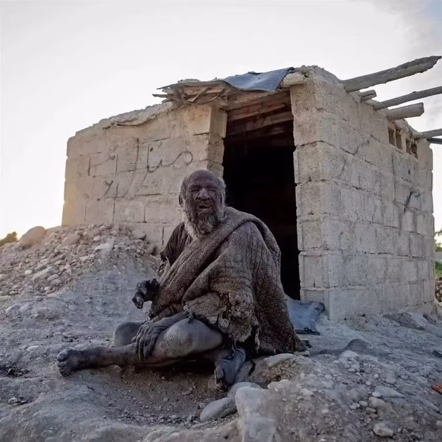 這位老人名叫阿穆·哈吉,生活在伊朗南部法爾斯省德傑加村,村子地處沙漠邊緣,環境惡劣,風沙大、降水少。 老人一生孤苦,住的是不足幾平方米的煤渣磚棚屋,沒有門窗、不通水電,四面堆滿磚石泥土,條件簡陋到極致。 他的模樣,重新整理了所有人對「髒」的認知。